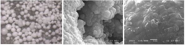 From Figure 3 we can see that catalysts prepared on DYC Technology Platform showed very good sphericity and open pore architecture (left photo),compared to the SEM photo of common cracking catalyst, clear difference can be found.. With the same amplification factor, zeolite particles locating on microsphere and porous wall with multilevel pore-size distribution (middle photo) can be clearly seen on surface of catalyst prepared by DYC Technology Platform. However, the surface of catalyst prepared by traditional technology is platy due to binding agent. Neither zeolite nor pore structure is obvious.